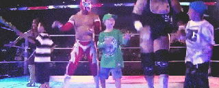 A kid comes in with a goat face mask and Daniel Bryan screams at him.