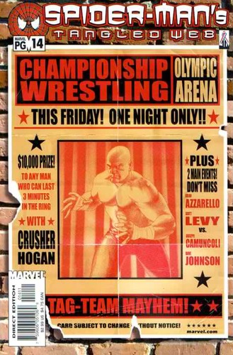 The Tangled Web series focuses on the villains in the Spider-Man universe. #14 does not focus on a villain exactly but it is centered around Crusher Hogan (Bonesaw McGraw in the film version), the wrestler Spider-Man faced on that one fateful night. There’s an additional wrestling connection with this issue. It was co written by Scott Levy AKA Raven AKA Johnny Polo AKA He doesn’t want you to remember he’s Johnny Polo!