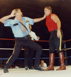 This one a two-fer. Since law and order in the World Wrestling Federation is … “fluid,” not one but two men tried to become the embodiment of Justice: The Big Bossman and The Mountie. Unfortunately, they were both corrupted upon arrival. The Bossman eventually redeemed himself, living up to his theme music and Policeman’s … sash. His gear – used in post-match assaults – stopped being symbols of brutality. Instead, the twirl of the nightstick became for misdirection for a spinning right hook. The Mountie, conversely, never upheld the law, the exact opposite of his theme’s lyrics. Armed with a Cattle Prod, the Mountie ran about the WWF shocking … well, everybody, when he won the Intercontinental Championship. Inevitably, these two “law enforcers” clashed in a dispute over US versus Canada jurisdiction, culminating with the Mountie spending a night in a New York City jail.