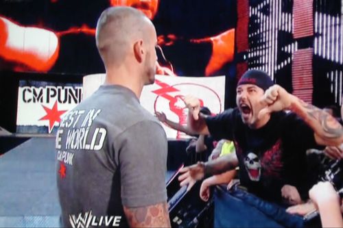 CM Punk interrupts Bret Hart and comes out mocking him As he makes his way down the ring, a fan confronts him.
