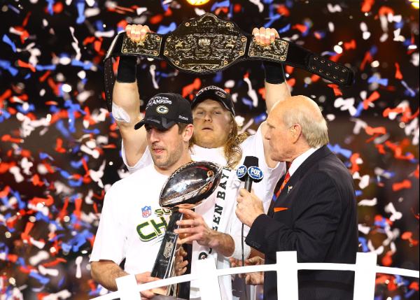 One of the best things about the return of the NFL – from a wrestling fan’s perspective – is seeing all the NFL Player/ Wrestling Fan crossover. The culmination of this is probably when the Green Bay Packers won Superbowl 45 and debuted a World Championship Title: