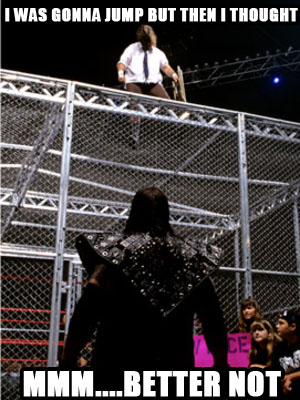 #RejectedAttitudeEraStorylines Mankind looks up at the top of the cell, thinks “No, I don’t fancy that”, and walks back to the locker room.