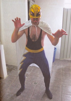 In Mexico, purchasing lucha libre gear comes with a training session. It’s like a Groupon voucher. So Karl gets trained int he basics of wrestling by a luchador who calls himself, “The Shocker.”