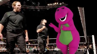 ThreeManBooth: The Shield is attacking The Ryback because of his Purple Singlet. Barney the Dinosaur was an Injustice against PBS. #ShieldBabies.