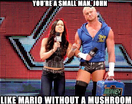 AJ says Cena is a small man. Cena takes the obvious route while making a joke at his expense.