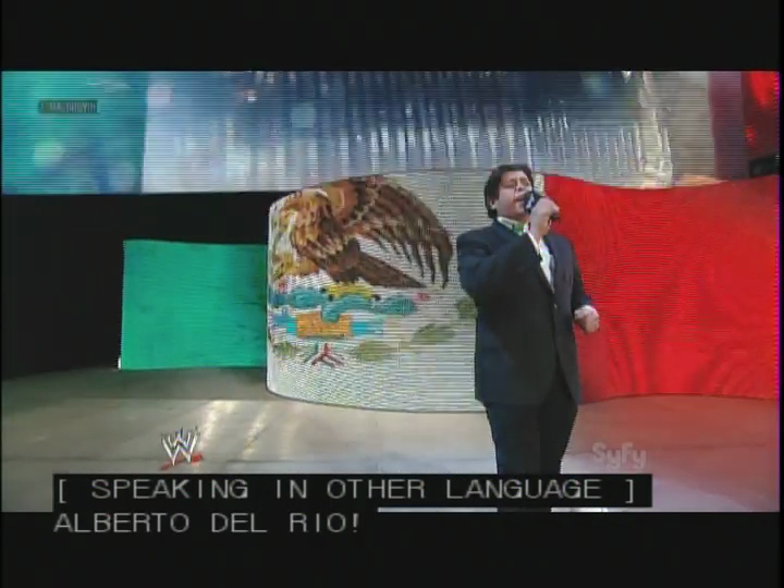 Really? “Speaking in Other Language?” Not Spanish? You mean to tell me you can’t tell what language Ricardo Rodriguez is speaking? The guy wearing a Mexican themed bowtie in front of a digital image of the Mexican flag? Also, you completely mis-spelled how RicRod pronounces “Alberto Del Rio.” It’s missing at least 18 O’s.