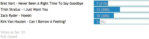 Of the 3 choices (you didn’t think Kirk Van Houten was a real contender, did you?), Trish’s song is the only one that’s an actual love song. “Hoeski” is about … well, and “Never Been A Right Time to Say Goodbye” is about heartbreak (no pun intended). Technically, “I Just Want You” is the underdog in the fight: it’s the only love song, it’s the only song by a WWE Diva and it’s the only song not to Chart anywhere, be it the UK (Bret) or the iTunes (Ryder). But has Trish Stratus ever truly been an underdog?