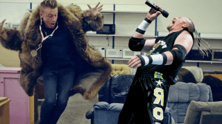 The New Age Outlaws do their bit, but Road Dogg modifies it by making a Mackelmore and Ryan Lewis “Thrift Shop” reference.