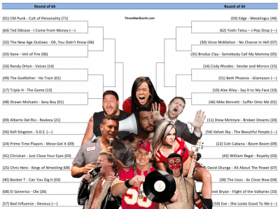 Here are the rules for the theme selection: basically, we wanted to avoid the inevitable face-off between the “classic themes” (Hogan, Savage, Flair) and … well, Stone Cold Steve Austin. So we limited eligible themes to only ones heard in the past 14 months. That meant that a lot of current promotions’ rosters were eligible. It also meant that recently retired wrestlers like Edge or recurring semi-retired wrestlers like Mick Foley or even one-off Superstars like Doink the Clown were eligible via creative use of the loophole. The strongest use of this is probably the inclusion of “The Kings of Wrestling” theme: Chris Hero used it in January 2012 before becoming Kassius Ohno. #StillCounts!