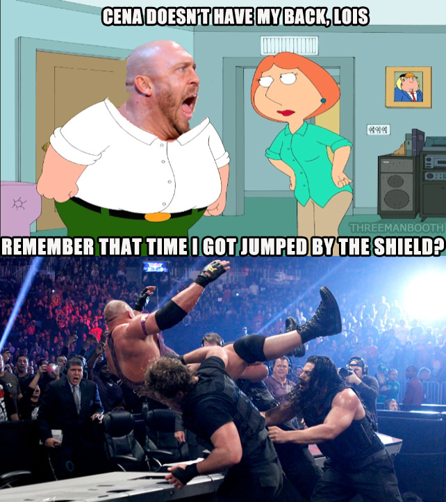 The Shield was just shown backstage. John Cena’s going to reveal via DNA test that Ryback and The Shield are related.