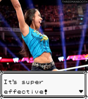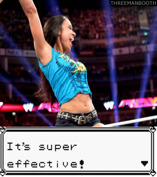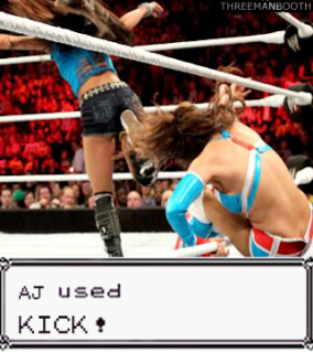 AJ Lee hops in Tamina’s arms. Tamina puts AJ down then Superkicks her!