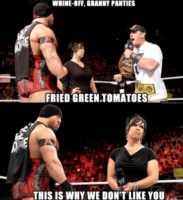 Vickie Guerrero allows John Cena to choose his stipulation first since he is the WWE Champion. Cena tells Ryback that he wants to be “fair” to him then suggests a match where the winner runs out of the ring like a girl. Cena suggests a Whine-Off like Ryback then imitates Ryback’s whining and liking the movie “Fried Green Tomatoes.”