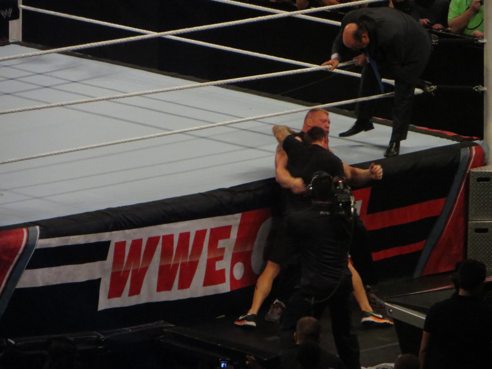 Paul Heyman cheapshots CM Punk, but Punk and Lesnar brawl. CM Punk tries his hardest, but is too weak to fight. Brock Lesnar throws him around like a ragdoll.