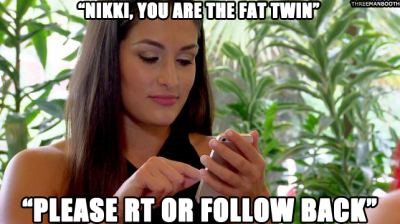 Nikki Bella is hanging with Eva Marie talking about Twitter. Eva Marie notices a tweet about Nikki Bella being fat and brings it to her attention. Nikki tries to ignore the haters.