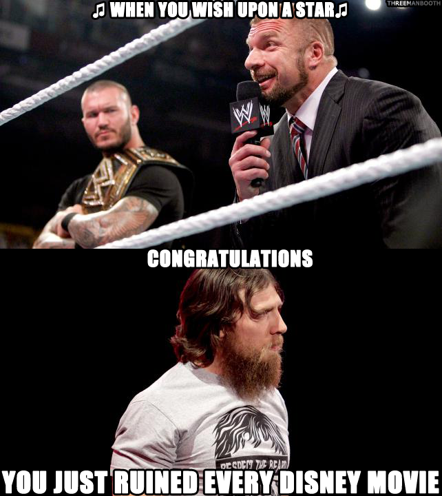 Daniel Bryan mocks Randy Orton’s role as the Face Of The WWE then tells Orton that at Night Of Champions, not only will Orton’s face be re-arranged, but Triple H’s vision of the future will be re-arranged as well because Bryan will become the new “WWE Champion.” After a “YES!” chant, Triple H calls Bryan’s “fantasy” adorable then calls him Jiminy Cricket. And if that wasn’t enough, Triple H starts by singing “When You Wish Upon A Star” to Bryan.