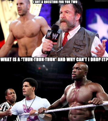Zeb Colter comes out and says last week, The Real Americans had their victories stolen from The Prime Time Players. Zeb Colter says the definition of a Prime Time Player is a bunch of people who embarrass themselves on a nightly basis by running around like buffoons and barking like dogs.