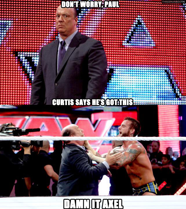 CM Punk is about to attack Paul Heyman, but Curtis Axel hits CM Punk with a low blow.