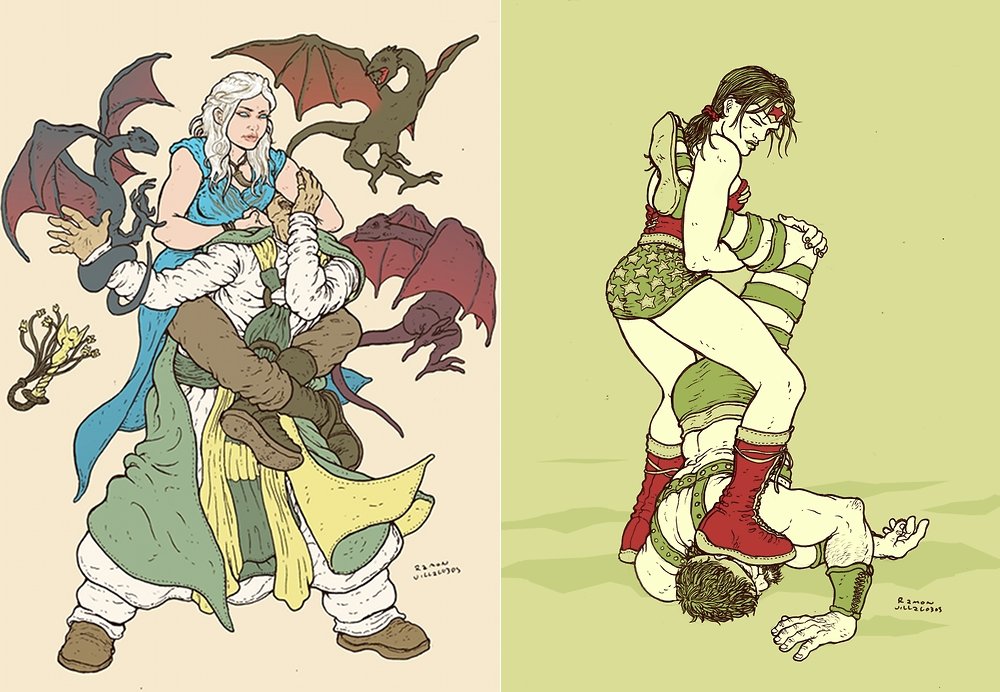 How cool does that look? It captures both the joy and the intensity that El Generico brought to his matches. Ramon can also add wrestling to non-wrestling situations and have it make complete sense. He has a running series, Man of 1000 Holds, where he depicts fictional characters performing wrestling holds. Ramon captured Daenerys Targaryen, from HBO’s Game of Thrones, performing a Dragon Sleeper. If the Mother of Dragons defeated all her rivals with the Dragon Sleeper, we’d not only watch the show but we’d read the books. Winter may be coming but it’s tapping out!