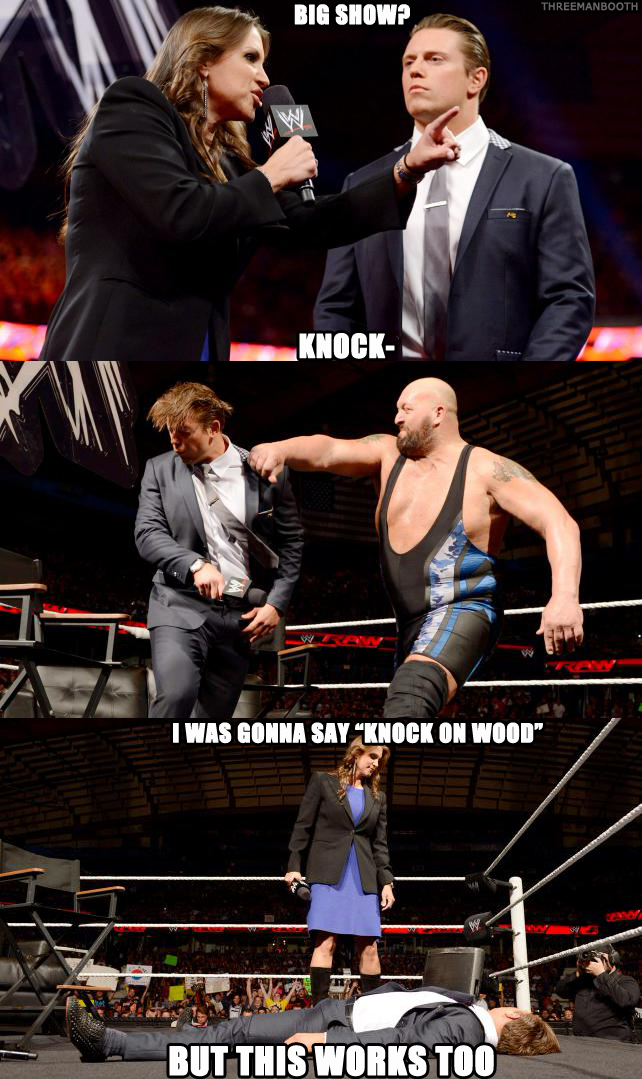 Big Show doesn’t respond. The Miz tells Big Show that he understands Big Show’s personal issues and the situation he was in last week, but tells Big Show that Triple H and Stephanie McMahon are trying to break him. Miz says that Big Show is the largest guy in the locker room, who everyone respects and if Triple H and Stephanie break him, they can break everybody. The Miz tells Big Show that the WWE Superstars are starting to step up and that it’s time for Big Show to step up.