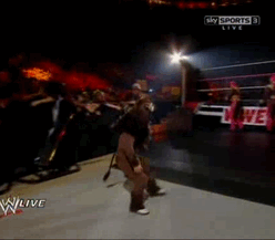 CM Punk’s theme song plays and Paul Heyman and Ryback look around for him. CM Punk comes through the crowd. Jumps over the rail, then lands on his knee!