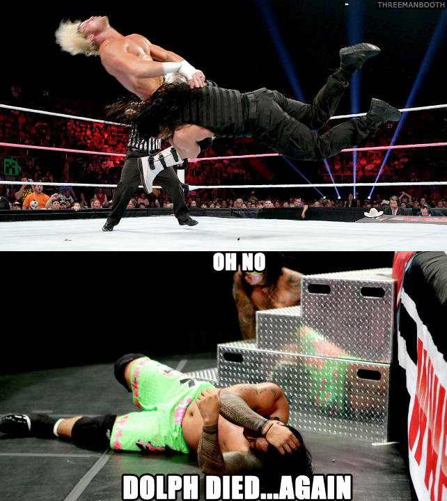 Roman Reigns hits the Spear on Dolph Ziggler.