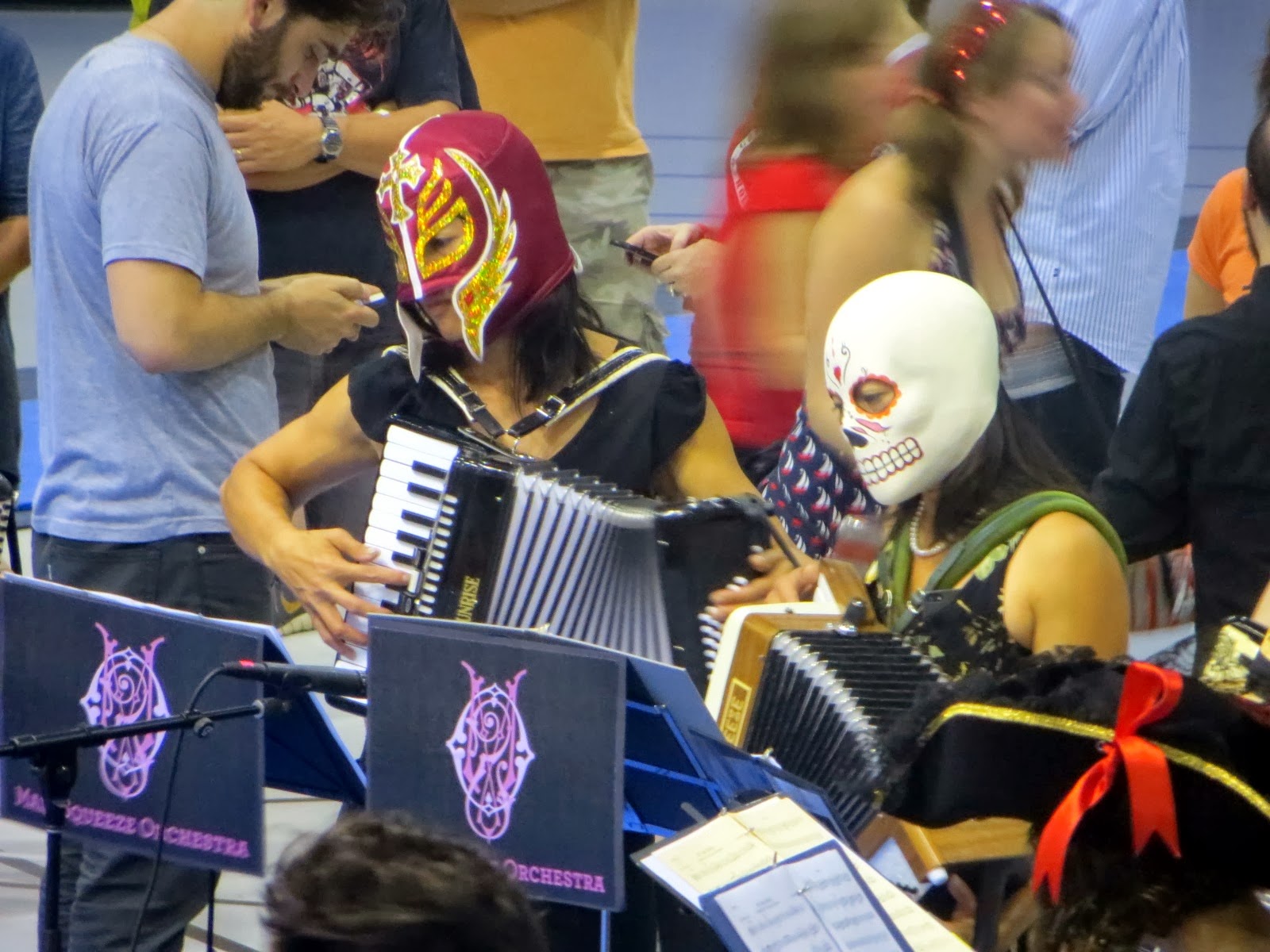 Another wrestling related connection came at intermission: there was a performance by the all female accordion group, the Main Squeeze Orchestra. They performed television theme songs and Lady Gaga’s “Bad Romance” while wearing, hats, hairpieces or wrestling masks.