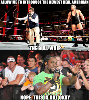 Post-Match, Zeb Colter says fool him once, shame on him, fool him twice, shame on America. Colter says he has a way of handling this situation, then introduces his newest little friend, a bull whip! Zeb Colter says that his bull whip is “no bull” then leads the Real Americans in saying the phrase, “We The People.”