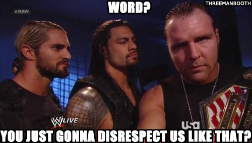Dean Ambrose says “Believe That.” After continuing the death stare, Roman Reigns yells “BELIEVE” in Dean Ambrose’s ear, then “In The Shield” to the camera.