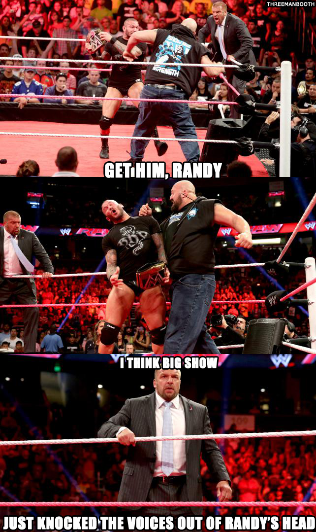 Big Show calls Triple H in the ring. Triple H takes off his suit jacket and tie, and almost gets in the ring to face Big Show!
