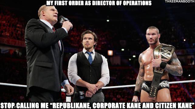 Kane comes out and says last week, he was appointed the Director Of Operations, which means that when Triple H and Stephanie McMahon are absent, he’s in charge tonight.
