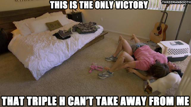 Daniel Bryan and Brie Bella get ready to go do Crossfit. Bryan tells Brie that he needs to pack for the next 13 days, and Brie helps him out. Daniel Bryan starts to joke about how ripped their dog Josie is. Brie shows Bryan her Guillotine Chokehold, which Bryan says she’s not doing correctly. Bryan and Brie play around, with Bryan coming out the winner.
