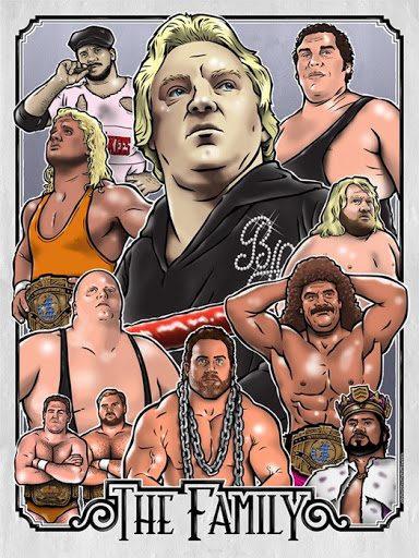 We’ve been showcasing members of The IWC, the Illustrated Wrestling Community, and the various art styles to admire. During the Holiday Season, a lot of artists make their work even more available as part of Black Friday / Cyber Monday promotions. Places like Bottleneck Gallery regularly have exhibits with several artists’ interpretations of the same topic. The theme of one exhibit was “I Love You Man.” Artist Darrin Shock took that to create a portrait of “The Family,” another name for Bobby Heenan’s collection of wrestlers also known as the Brain Trust: