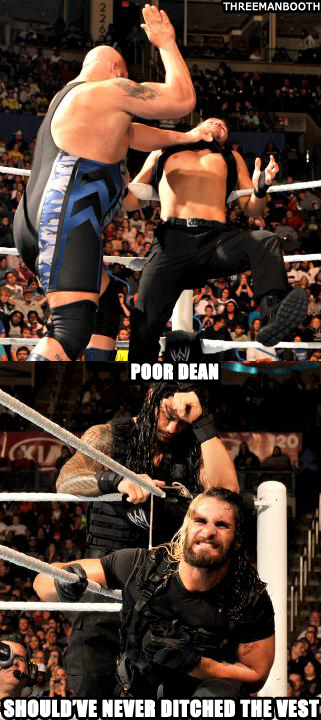 Roman Reigns hits the spear on Big Show. Cody Rhodes dives on top of Roman Reigns.