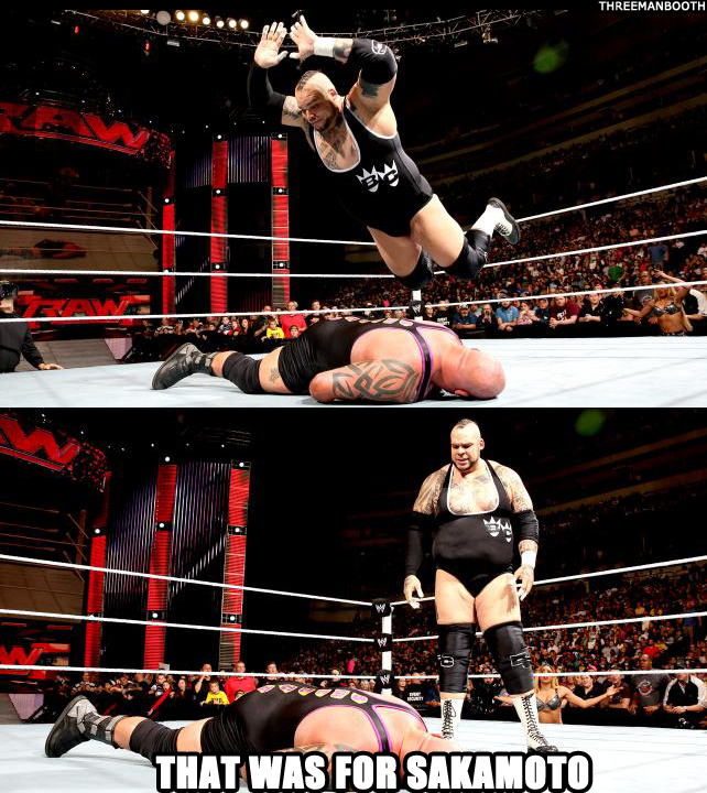 Post-Match, Brodus Clay attacks Tensai and splashes him multiple times.