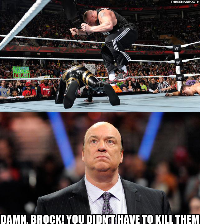Paul Heyman says that The Authority chose choice number 3, which means that Brock Lesnar will face nobody. And since Brock Lesnar didn’t get what he wants, this is what will happen…Brock Lesnar proceeds to beat Goldust and Cody Rhodes to a pulp with a chair.
