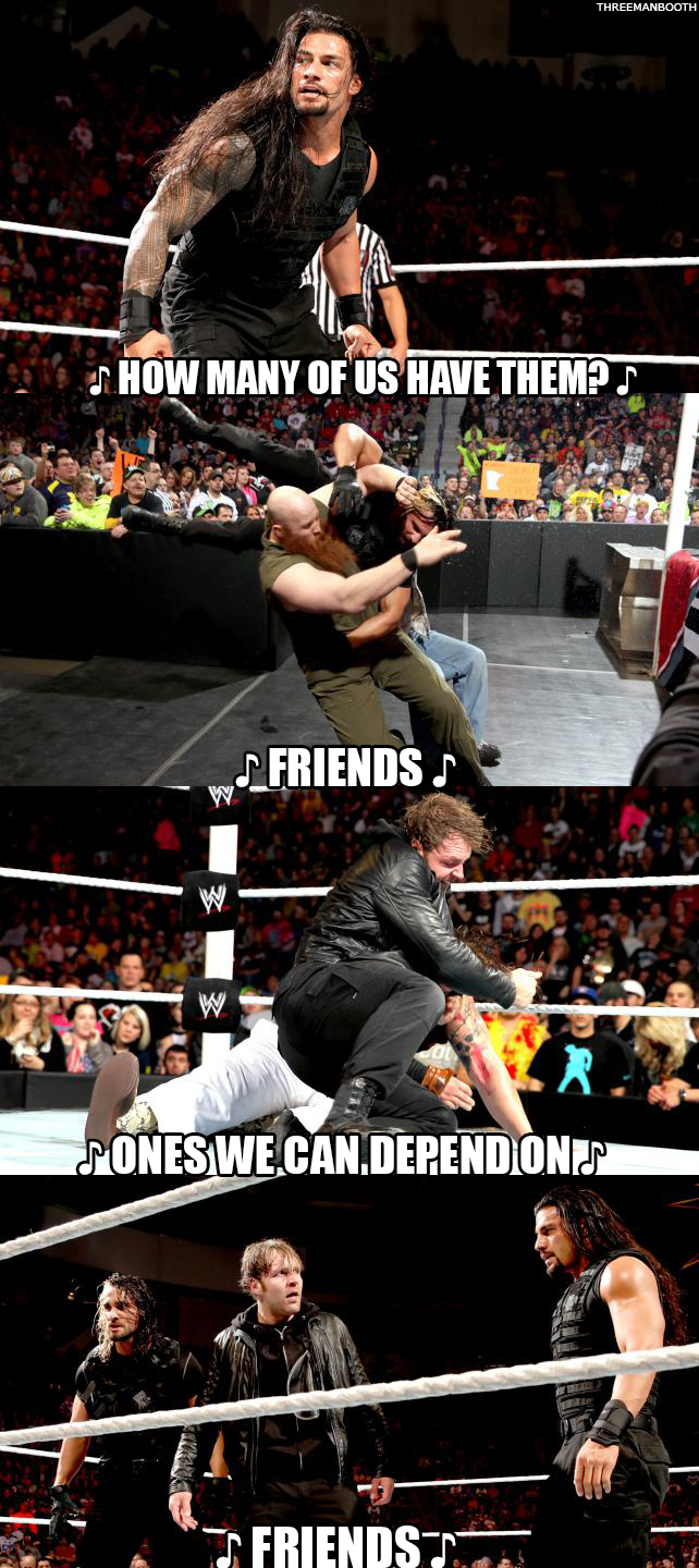 Seth Rollins comes out of nowhere to help Roman Reigns.