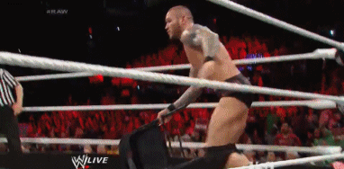 Randy Orton mocks the fan and hits a back suplex on Daniel Bryan through the table.