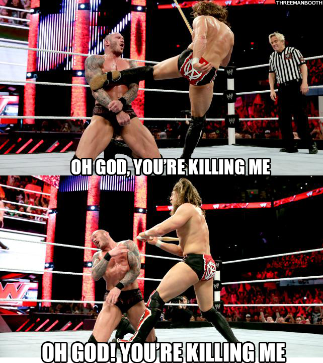 Daniel Bryan hits the kendo stick/kick combo on Randy Orton.