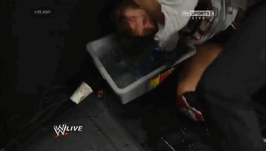 Daniel Bryan tries to fight back, but Triple H knocks him down and dunks Bryan’s head into a water container.