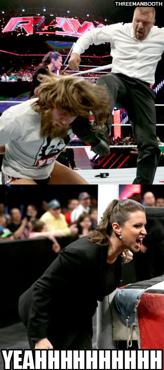 Triple H bodyslams Daniel Bryan onto the table, as Stephanie McMahon yells at Bryan.