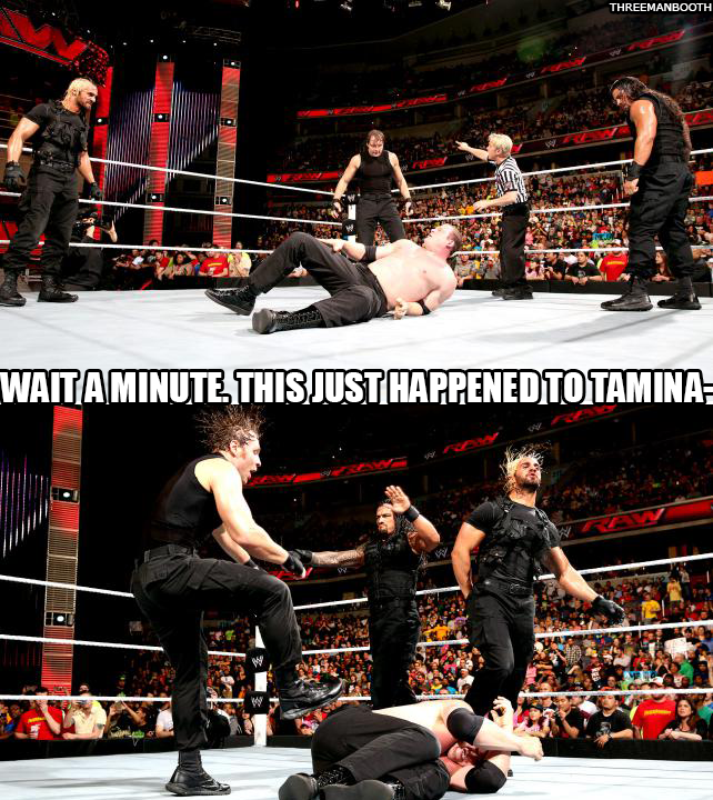 The New Age Outlaws try to get involved, but Dean Ambrose and Seth Rollins attack them.