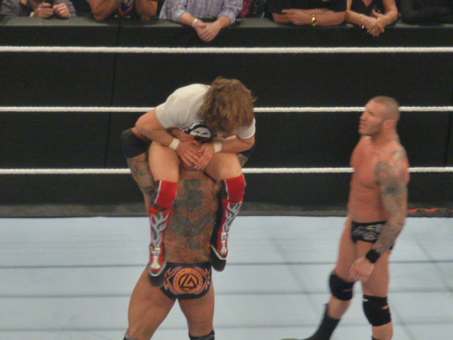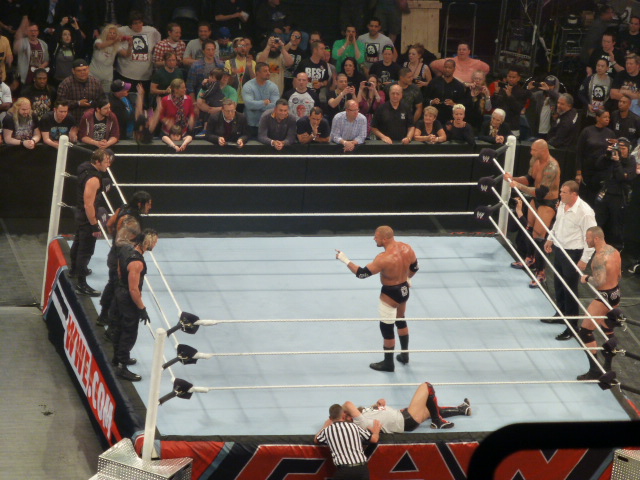 Randy Orton hits the RKO on Daniel Bryan. Batista follows up with a Batista Bomb on Bryan.