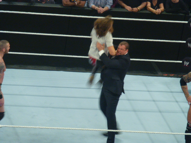 Triple H’s theme plays and Triple H comes down to the ring with Stephanie McMahon. Triple H and Stephanie McMahon force Mike Chioda to ring the bell.