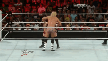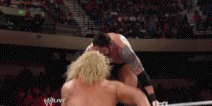 Bad News Barrett hits Dolph Ziggler with the Bullhammer.