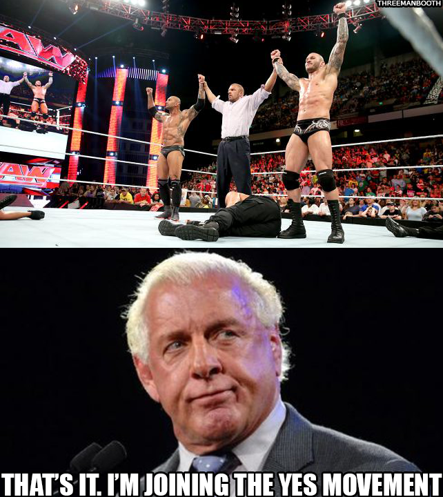Evolution proceeds to destroy The Shield with RKOs and Batista Bombs. Batista and Randy Orton hits the Batista Bomb-RKO on Dean Ambrose.