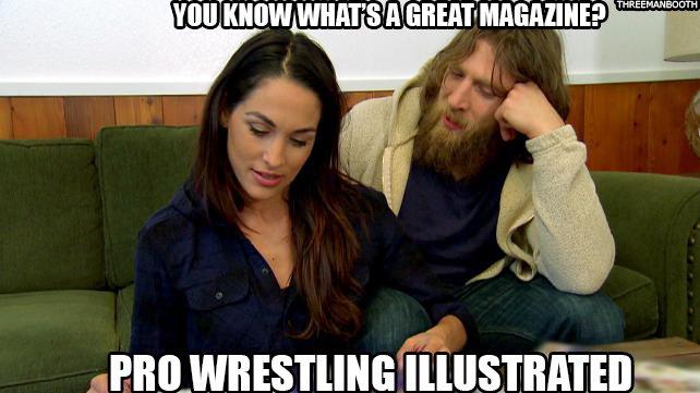 At Daniel Bryan’s house, Bryan and Brie are looking at Bridal Magazines. Brie wishes there were more men’s bridal magazines, but Bryan says the reason they don’t have that is because most men don’t care.