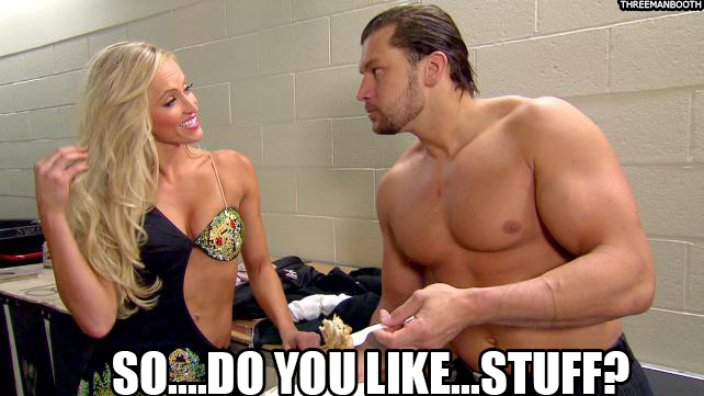 After the match, Summer Rae comments on Fandango being shirtless with dress pants. Summer thinks he looks great, but Fandango does ‘t feel great because they lost. Summer continues to awkwardly flirt with Fandango.