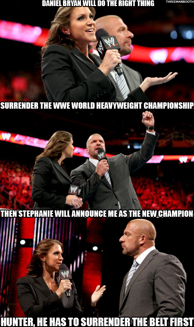 After a loud “Daniel Bryan” chant, Stephanie McMahon turns it around on the fans and says to cheer for Bryan because even though he wants to defend the championship, he can’t. Stephanie thinks Bryan will do the right thing tonight and give up the WWE World Heavyweight Championship.
