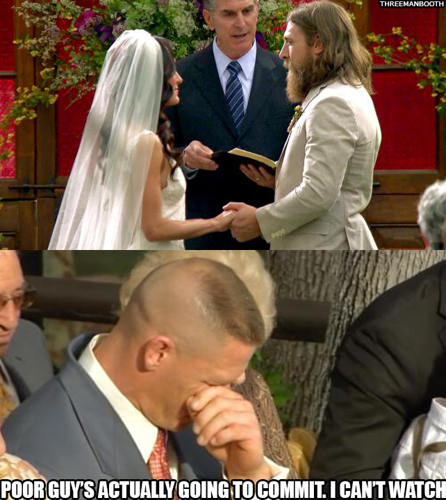 Daniel Bryan walks down the aisle. Brie Bella hasn’t been nervous until now. Brie Bella’s Dad tells her that she looks beautiful. Nikki Bella walks down the aisle next, happy to make eye contact with John Cena, but is concerned that Cena is mad at her. Josie comes down next.
