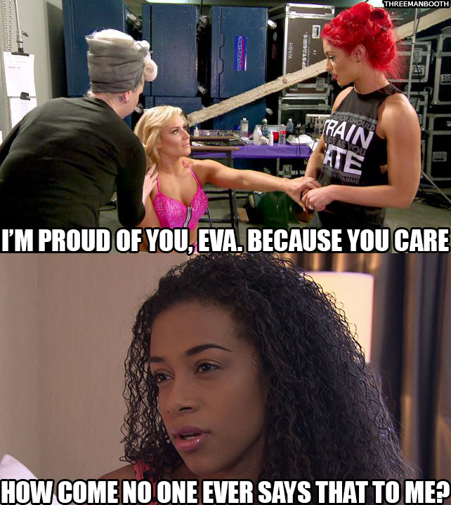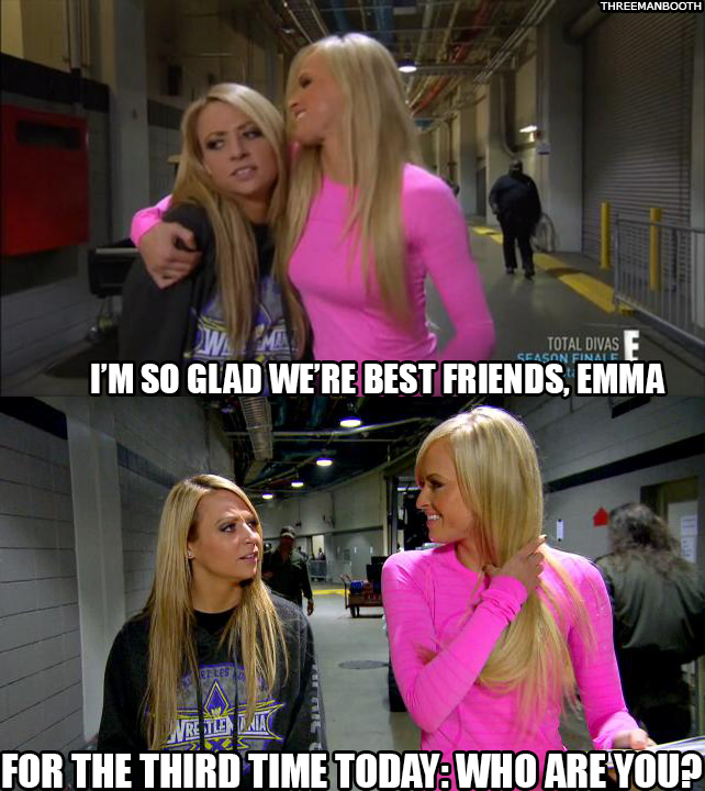 Summer Rae tells Emma that she’s glad that they’re “new best friends” because none of the other girls like her. Emma tells Summer Rae that maybe that would change if she would stop being such a bitch to the other Divas.